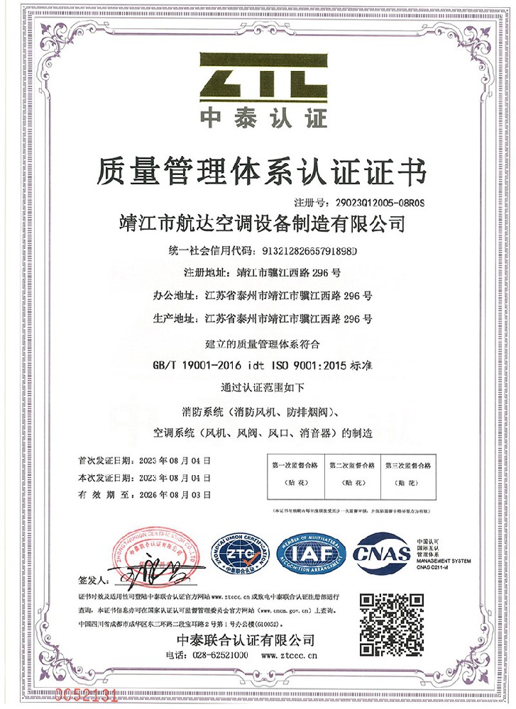 公司消防防排煙風(fēng)機(jī)、風(fēng)閥系列產(chǎn)品獲得消防產(chǎn)品證書(shū)、ISO9001國(guó)家質(zhì)量管理體系認(rèn)證證書(shū)。